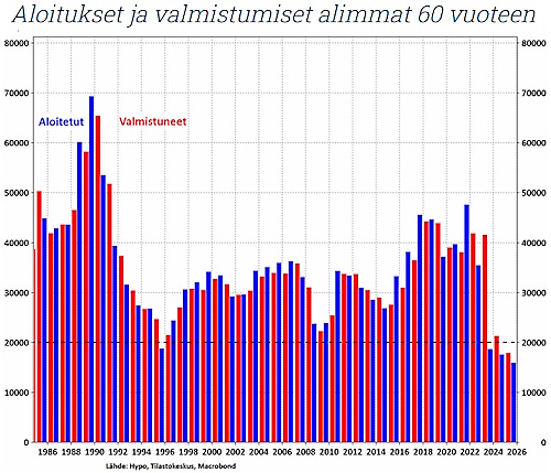 Hypon asuntomarkkinakatsauksen mukaan sekä uusien asuntojen aloitukset että valmistuvien asuntojen lukumäärä painuvat alimmilleen liki 60 vuoden tilastohistoriassa. Hinnat laskivat kolmatta vuotta peräkkäin. Asuntorakentajien ahdinko näyttäisi vielä jatkuvan ja kauppamäärät ovat edelleen vaatímattomia. Asuntomarkkinoilla on hiljaista, mutta Hypo:n asuntoindeksin lasku näyttäisi kuitenkin päättyneen.