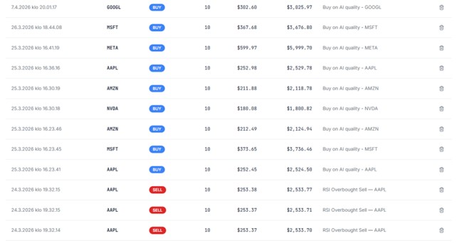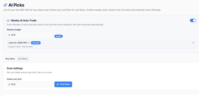 AI Picksin voi myös laittaa toimimaan täysin automaattisesti. Tekoäly selvittää viikoittain parhaat osto- ja myyntiehdokkaat ja ostaa niistä parasta ja myy salkun huonointa saman tien. Tekoäly perustelee valintansa ja ne tallentuvat järjestelmään.