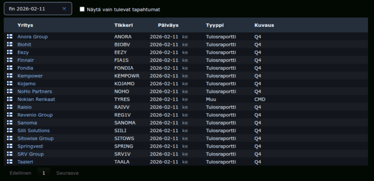 Voit myös yhdistää eri tekijöitä. Esimerkiksi ”fin 2026-02-11” näyttää kaikki kyseisen päivän Suomi-yhtiöiden tapahtumat.
