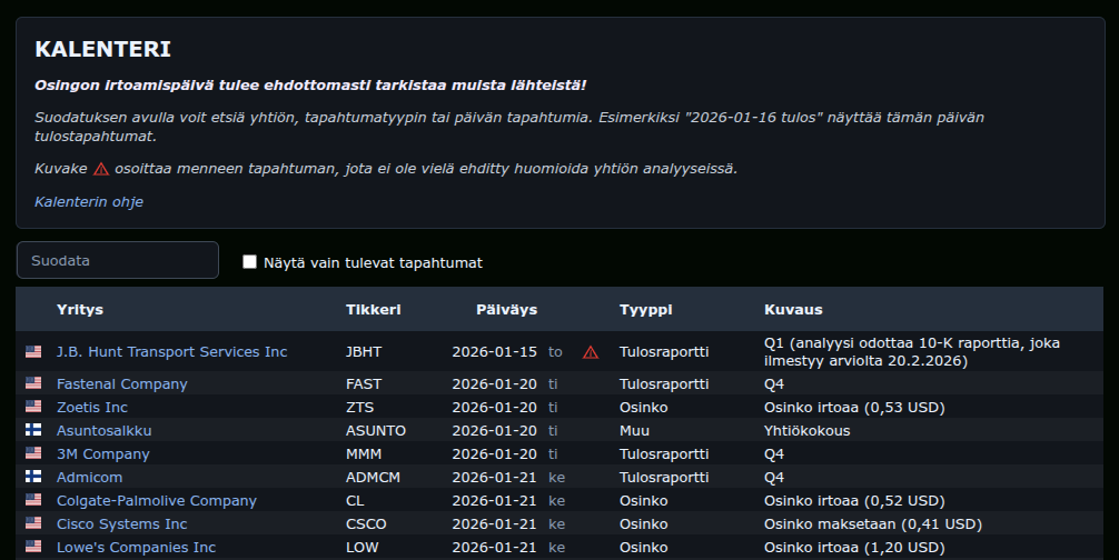 Jyrkin Listalle on nyt lisätty kalenteri, mihin on koottuna yhtiöiden tulospäivät, osinkojen irtoamis- ja maksupäivät sekä muut mielenkiintoiset tapahtumat. Näitä voivat olla esimerkiksi CMD (pääomamarkkinapäivä) tai yhtiökokous.