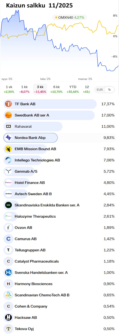 Kaizun salkku laski viimeisen 3kk aikana 2025 peräti 11.45%. Suurimman siijoituksen, Intellego AB, toimitusjohtaja on pidätetty ja viety kuulusteluihin epäiltynä törkeästä petoksesta koskien kvartaaliraporttien Q1, Q2 ja Q3 sisältöä. Osakkeen arvo laski 85% ja lopuksi pörssi lakkasi noteeraamasta yritystä.