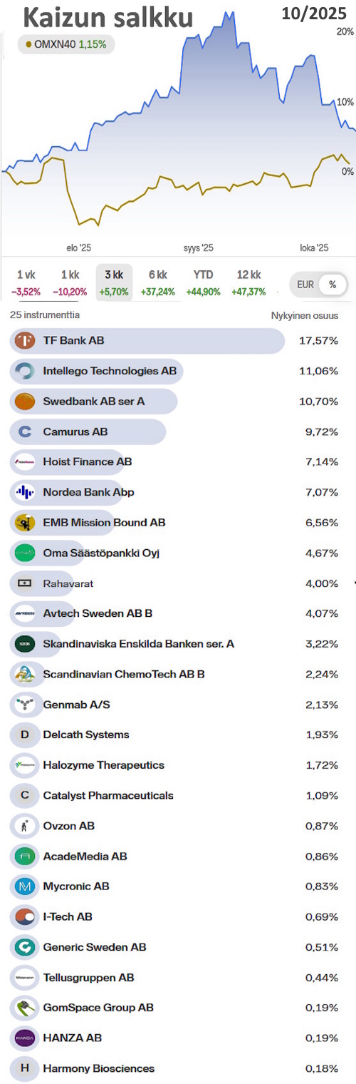 Kaizun salkku laski syys-lokakuun aikana 2025 peräti 15%. Syynä oli suurin sijoitus Intellego, jonka osuus salkusta oli jakson alussa 25%, ja jonka arvo laski 62%. Näihin joutuu tottumaan kun sijoittaa pieniin, muutaman kymmenen henkilöä työllistäviin yhtiöihin. Yksittäiset osakkeet voivat menettää kvartaalin aikana lähes kaiken arvonsa, mutta myös voitot voivat olla muhkeita. Tällä kertaa kuitenkin näin päin. Salkun kolmen kuukauden kehitys (+5,7%) kaikesta huolimatta voitti vertailuindeksin OMXN40 (+1,5%).