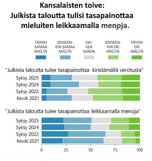 Puolet suomalaisista (51 %) on sitä mieltä, että julkista taloutta tulee tasapainottaa lisää leikkaamalla menoja, ja 29 prosenttia torjuu lisäleikkaukset. Veronkiristyksiä tasapainottamisen keinona kannattaa 31 prosenttia, ja 43 prosenttia torjuu veronkiristykset. Veronkiristysten kannatus on laskenut vuodessa 7 prosenttiyksikköä.