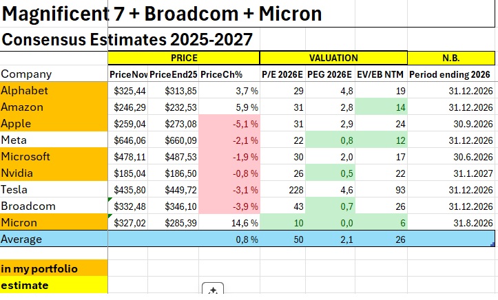 - PEG-luku (P/E suhteutettuna EPS-kasvuvauhtiin vuonna 2026) on matala yhtiöillä Meta, NVidia, Broadcom ja Micron)