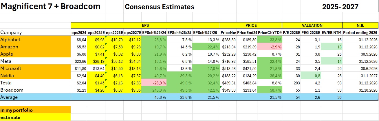 Päivitin Mag7+Broadcom-seurantani. Lisäsin vuoden 2027 EPS-ennusteet sekä EPSin ennakoidut kasvuprosentit vuosittain.