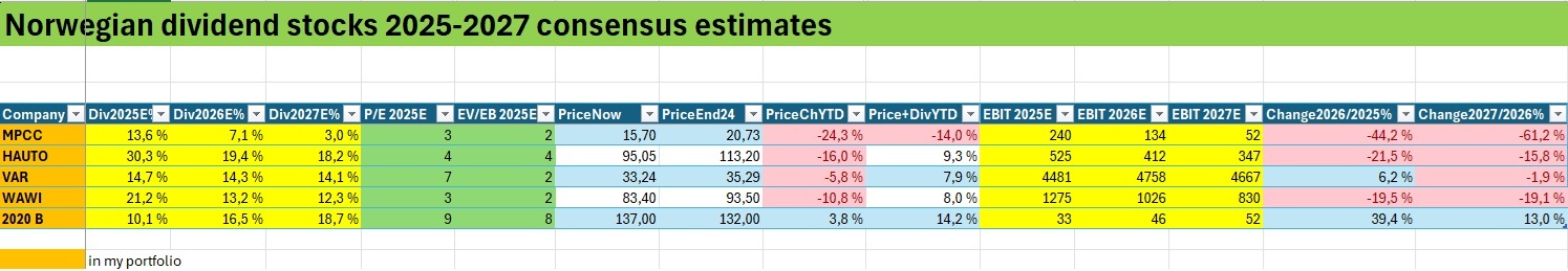 Minulla on Nordnetin sijoitusvakuutuksessa seuraavat norjalaiset osakkeet, lähinnä isojen osinkojen takia. Sijoitusvakuutuksessa on se etu, että osinkojen lähdevero on 0% kun se normaalisti on 25%. Käytän arvioissani konsensusennusteita. En tunne näitä firmoja vielä niin hyvin, että pystyisin tekemään hyviä omia arvioitani.