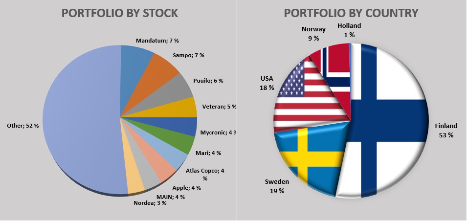 Salkkujeni kokonaisarvosta noin puolet on edelleen Suomessa. Suurimmat sijoitukset ovat myös suomalaisia. 10 suurinta muodostaa noin puolet salkun arvosta ja loput 49 toisen puolen. Pääpaino on defensiivisissä osinko-osakkeissa.
