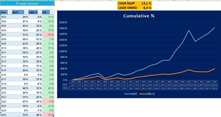 Oman salkun kehitys on tänä vuonna ollut heikompaa kuin yleisindeksin. Syynä tähän on ainakin ruotsalaisten osakkeiden heikompi vuosi ja se, että salkustani puuttuu monta tämän vuoden hyvää nousijaa Suomessa. Esimerkiksi Neste ja Nokia, joilla on iso paino indeksissä. Todellisuudessa salkkujeni kehitys tänä vuonna on ollut hieman parempi kuin 12%, koska tässä luvussa on mukana vain Nordnet-salkkujen kehitys. Amerikkalaiset osakkeet ovat kehittyneet hyvin tänä vuonna ja ne ovat pääosin Degirossa.