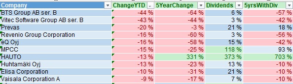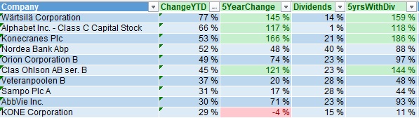 Salkun kokonaistuotto osinkojen kanssa on 17%. Parhaat kurssinousut (ilman osinkoja) ovat tuoneet seuraavat: